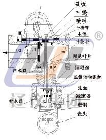 流量計是按節(jié)流元件,分流原理設計制造的;被測蒸汽進入流量計主體后分為兩路,一路Q1通過節(jié)流孔板(此部分蒸汽不作計量),在孔板兩側產生壓差△P,在此壓差作用下,另一路Q2流經噴嘴噴射在葉輪上,葉輪軸轉動。為減慢葉輪軸轉速,葉輪軸下方按有阻尼葉片并浸沒在阻尼室內水中。由于兩路有同一壓差△P,在規(guī)定流量范圍內,根據流體相似原理,兩路蒸汽流量Q1和Q2之間的比例關系基本為常量,這樣只要測出流經噴嘴部分的流量Q2,即可知總流量Q。